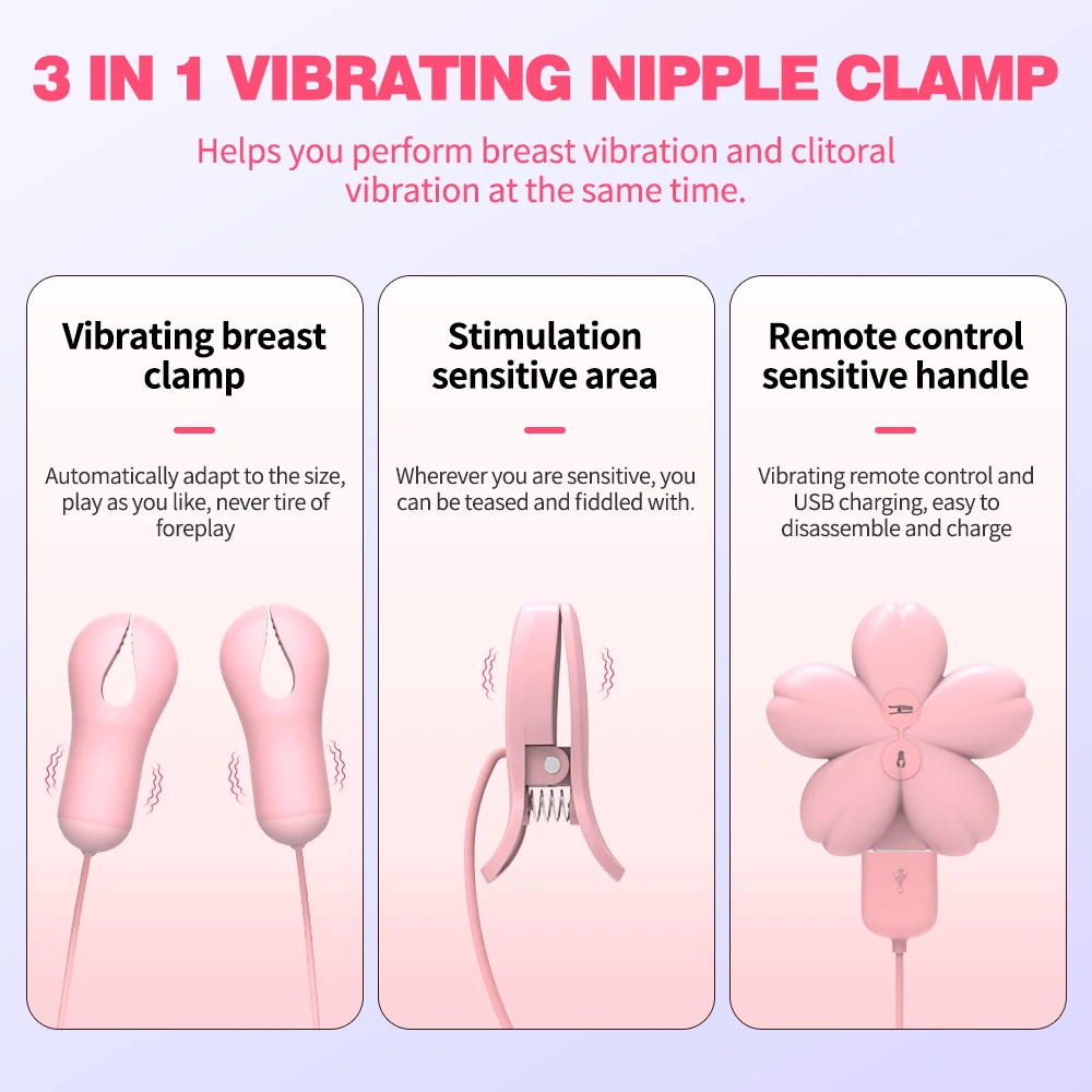 🌸—This is a set of three-head clamp vibrators. Both the breast clamp and labia clamp have 10 vibration modes. They are equipped with a remote control to operate, freeing your hands to enjoy other fun. Its rhythmic movement stimulates blood flow and increases sensitivity. Adjustable nipple clamps for men and women, with serrated inner walls for perfect fixation and high-frequency vibration to prevent them from falling off, energize your sex life with this vibrant and romantic Sakura sex toy!